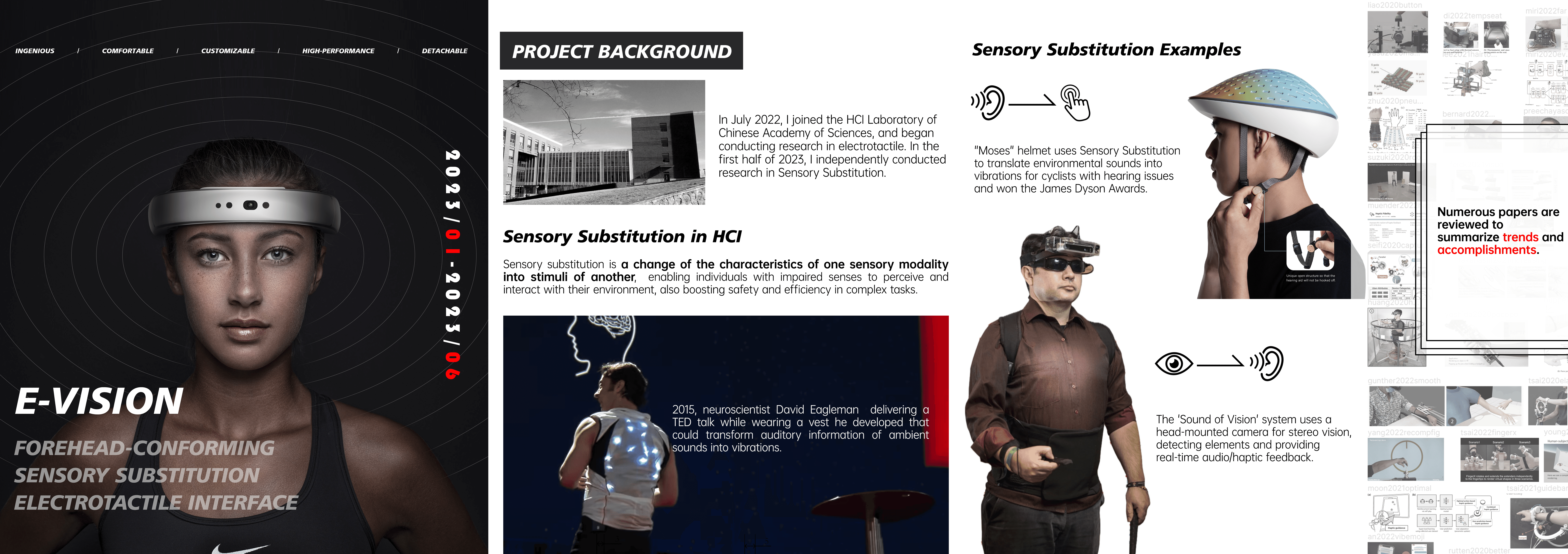 E-Vision is a wearable device that leverages Sensory Substitution to provide electrotactile augmentation or even substitution of vision. It custom-molds its interface using vacuum forming.